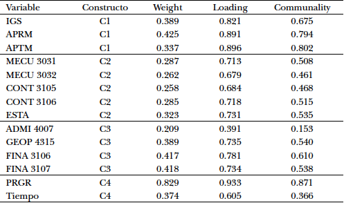 La metodología PLSPM trabaja básicamente en tres pasos. Primero, se calculan ponderaciones (weights) en cada constructo, para combinarse linealmente con las variables asociadas a cada constructo y originar valores (scores) representativos. Segundo, se calculan las correlaciones (loadings) entre los scores y las variables asociadas a cada constructo. Tercero, se calculan los coeficientes del sistema de relaciones lineales de la Figura 1. La Tabla 4 presenta los cálculos mencionados en los dos primeros pasos, además presenta el cálculo de communality para cada variable asociada a su constructo. Se observa que el valor más bajo es para la variable ADMI 4007, la cual aporta solo el 15.3% de su variabilidad al constructo C3. Esta variabilidad es mucho menor que el 45% que sugieren los autores de este trabajo, a pesar de que Sánchez (2013) sugiere una variabilidad de 50%. Este resultado motivó el retiro de dicha variable y el reprocesamiento de los datos, con una variable menos asociada al constructo C3.