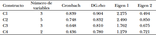 Para medir la consistencia interna de cada constructo, se determinó el alpha de Cronbach y una mejor medida de consistencia interna basada en los loadings llamada rho de Dillon y Goldstein (DG.rho); en todos los casos son mayores de 0.7; además, los primeros autovalores (eigen) de la matriz de correlaciones de las variables asociadas al constructo son mayores de 1, tal como muestra la Tabla 5; y ratifican la consistencia interna en cada constructo.