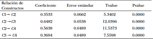 La Tabla 6 muestra los coeficientes positivos del sistema de relaciones lineales entre constructos representados en el modelo propuesto de la Figura 2, donde se muestran además las variables asociadas a cada constructo.