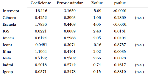 La Tabla 7 muestra la evaluación del modelo de regresión logística propuesto. Se observa que cuatro variables no son significativas (n.s.); estas son: género del estudiante, Icont, Iadmi e Igeop; por lo tanto, hay cinco variables significativas que sí influyen en el éxito académico del estudiante: tipo de escuela, IGS, Imecu, Ifina e Iesta.