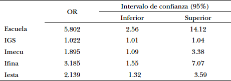 Se construyó un modelo de regresión logística para el éxito académico considerando las variables que resultaron significativas en el modelo que se ilustra en la Tabla 7. Se calcularon los OR y un intervalo del 95% de confianza para los mismos. Los resultados se muestran en la Tabla 8.