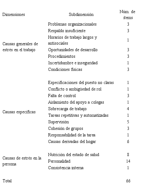 Se diseñaron dos encuestas, la primera integrada por 66 ítems dirigidos al personal de confianza de la organización, clasificados en tres dimensiones: (a) causas generales de estrés en el trabajo, (b) causas específicas y (c) causas de estrés en la persona; la segunda se conformó de 33 ítems orientados al personal operativo, los cuales se integraron también en las mismas tres dimensiones reduciendo el número de ítems.