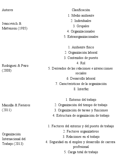 Uno de los elementos básicos relacionados con el estrés es el estresor, el agente que induce al estado de estrés. En un primer acercamiento, Ivancevich & Mattenson (1985) conceptualizaron al estresor como el acontecimiento, la situación, el objeto o la persona que indica cambios o adaptaciones en el individuo; es decir, un estresor es el estímulo que provoca una respuesta de estrés. Por su parte, Mansilla & Favieres (2011) enuncian que los estresores comprenden características del trabajador y su interacción con la organización; en este sentido, todo suceso o situación que encontramos en nuestro medio ambiente puede ser un estresor; no obstante, las condiciones externas siguen teniendo mucha mayor probabilidad de operar como un estresor que otro tipo de variables (Tabla 1).