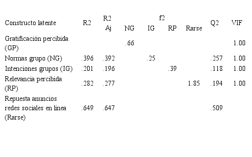 Para examinar el modelo estructural y según lo recomendado por Hair et al. (2017), primero, verificamos el modelo estructural de problemas de colinealidad al examinar el factor de inflación de la varianza (VIF, por sus siglas en inglés) de todos los conjuntos de constructos predictores en el modelo estructural. Todos los valores de VIF están claramente por debajo del límite de 5; por lo tanto, la colinealidad entre los constructos predictores no es un problema crítico en el modelo estructural (Tabla 3). De hecho, los valores de uno en todos los VIF se deben a que, según el modelo planteado, se examinaba el efecto de una variable independiente sobre una variable dependiente a la vez. Además, la Tabla 3 muestra los valores R2 que es una medida del poder predictivo del modelo y que representa la cantidad de varianza en los constructos o variables dependientes explicada por todos los constructos o variables independientes vinculada a ella. En este estudio, la proporción de la varianza total (R2) de cada variable (en su carácter de variable dependiente) explicada por el modelo es 64.9% (0.649) para respuesta a anuncios en redes sociales en línea, 28.2% (0.282) para relevancia percibida de los anuncios, 20.1% (0.201) para intenciones de grupo y 39.6% (0.396) para normas de grupo (Tabla 3). Además, los valores de Q2 de todas las variables (en su carácter de variables dependientes) muestran valores superiores a cero (Q2 > 0) proveyendo apoyo a la relevancia predictiva del modelo y sus constructos o variables.