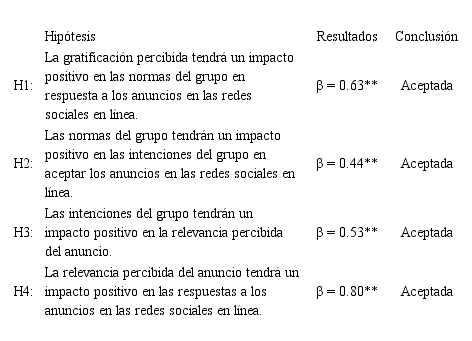 En la Figura 2, se muestran los resultados del modelo estructural, incluyendo los valores beta de las diferentes relaciones hipotéticas planteadas en el modelo. Las cuatro relaciones hipotéticas planteadas mostraron relaciones estadísticamente significativas, a un nivel de significancia de 0.01. Los resultados encontrados apoyan las hipótesis 1 a la 4. Primeramente, la gratificación percibida, particularmente en las redes sociales en línea, tiene un impacto positivo en las normas del grupo o creencias compartidas por los estudiantes miembros de una comunidad virtual (H1: β = 0.63; p < 0.01). A su vez, las creencias compartidas por los estudiantes como miembros de una comunidad virtual, es decir, normas de grupo, tienen un impacto positivo sobre el desarrollo de sentimientos grupales que ayudan a formar intenciones o acciones, esto es, intenciones del grupo en aceptar los anuncios en las redes sociales en línea (H2: β = 0.44; p < 0.01). De igual manera, el desarrollo de sentimientos grupales o intenciones del grupo tienen un impacto positivo en el grado en que el usuario se identifica con el anuncio, es decir, la relevancia percibida de los anuncios dentro de las comunidades virtuales (H3: β = 0.53; p < 0.01). La relevancia percibida del anuncio tiene un impacto positivo en las actitudes y comportamientos del consumidor hacia los anuncios en las redes sociales en línea, esto es, la respuesta hacia los anuncios en las redes sociales en línea (H4: β = 0.80; p < 0.01) (Tabla 4). Los datos sobre el poder predictivo (R2; f 2) entre las relaciones hipotéticas planteadas fueron mostrados en la Tabla 3 y discutidos previamente. En general, los resultados validan el modelo propuesto y apoyan las cuatro hipótesis.