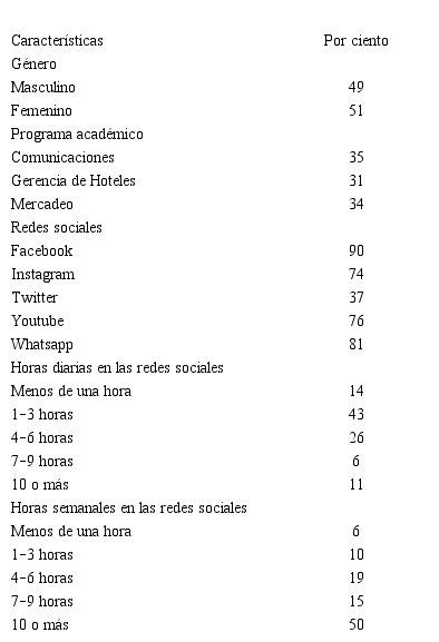 El proceso de recolección de los datos comenzó con una invitación a los estudiantes a participar del estudio, colocando flyers en los tablones de anuncios de la universidad. Los estudiantes interesados asistían a un lugar designado y, luego de que se explicara el propósito del estudio, de manera libre y voluntaria procedían a contestar el cuestionario. Al cabo de dos semanas de administrar el cuestionario, se recolectaron 147 cuestionarios contestados representando un 100% del tamaño de la muestra propuesta. En la Tabla 5 se presentan los datos sociodemográficos de los encuestados, así como sus preferencias en las redes sociales en línea y el tiempo que le dedican.
