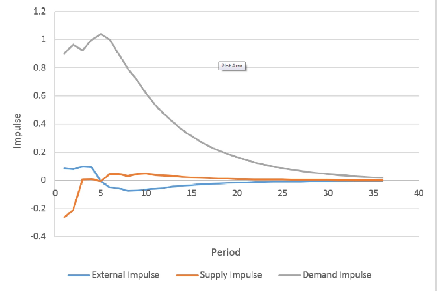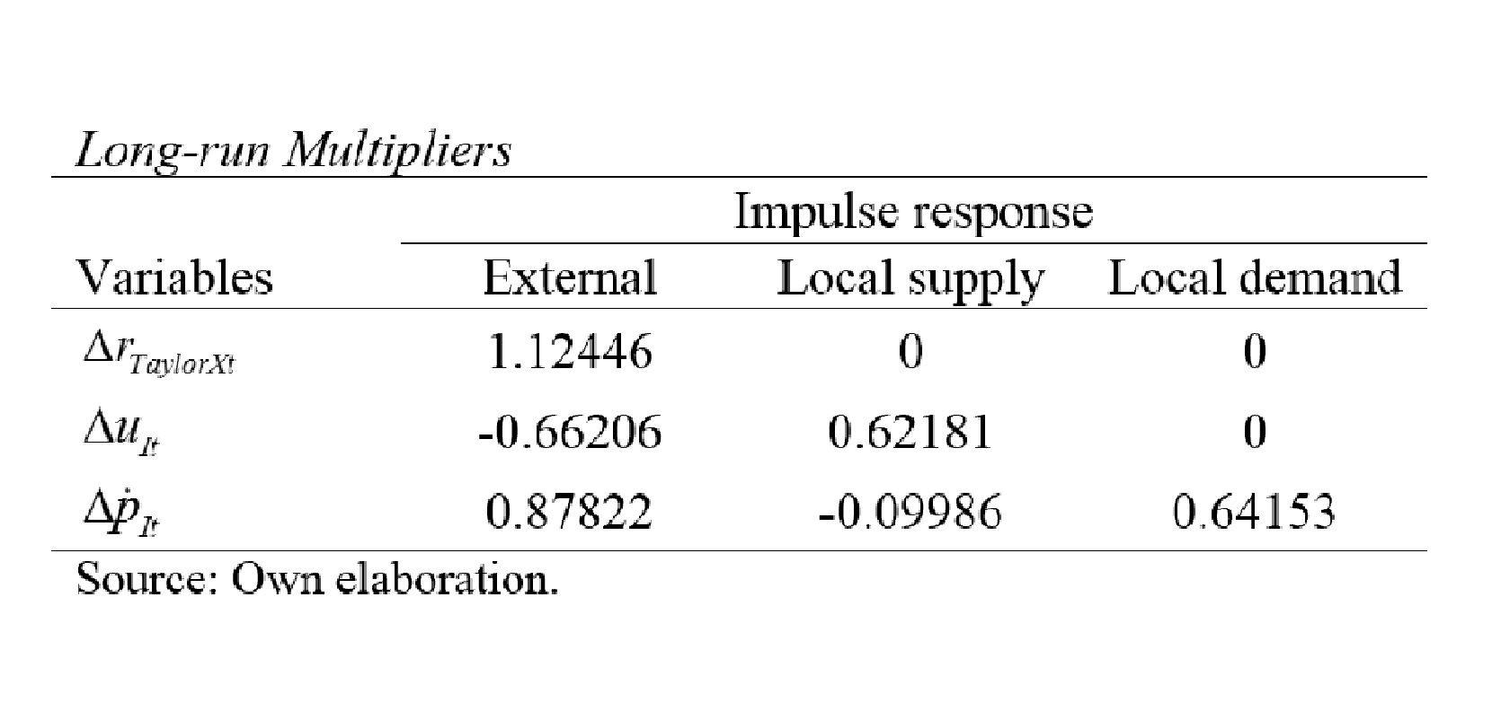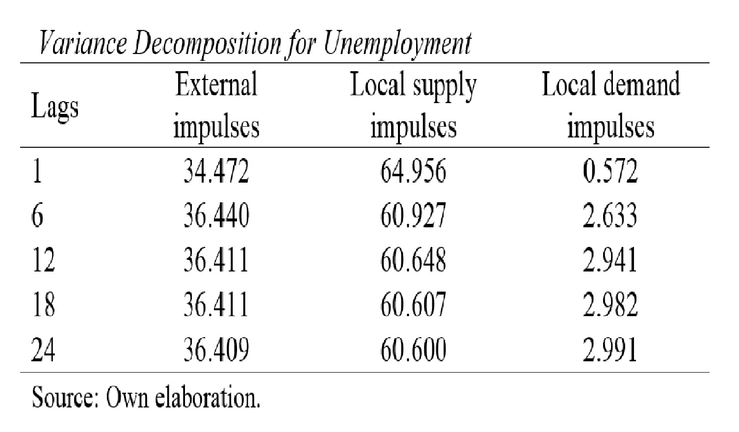 According to the results of the variance decomposition, supply shocks affect over 60% and external shocks over 35% of the deviations of unemployment in its long-run trend. This means that this model depends crucially on changes in productivity and the way in which the United States structures the monetary policy rule and other factors that affect the supply side of the economy. Aggregate demand seems to have little effect on unemployment.