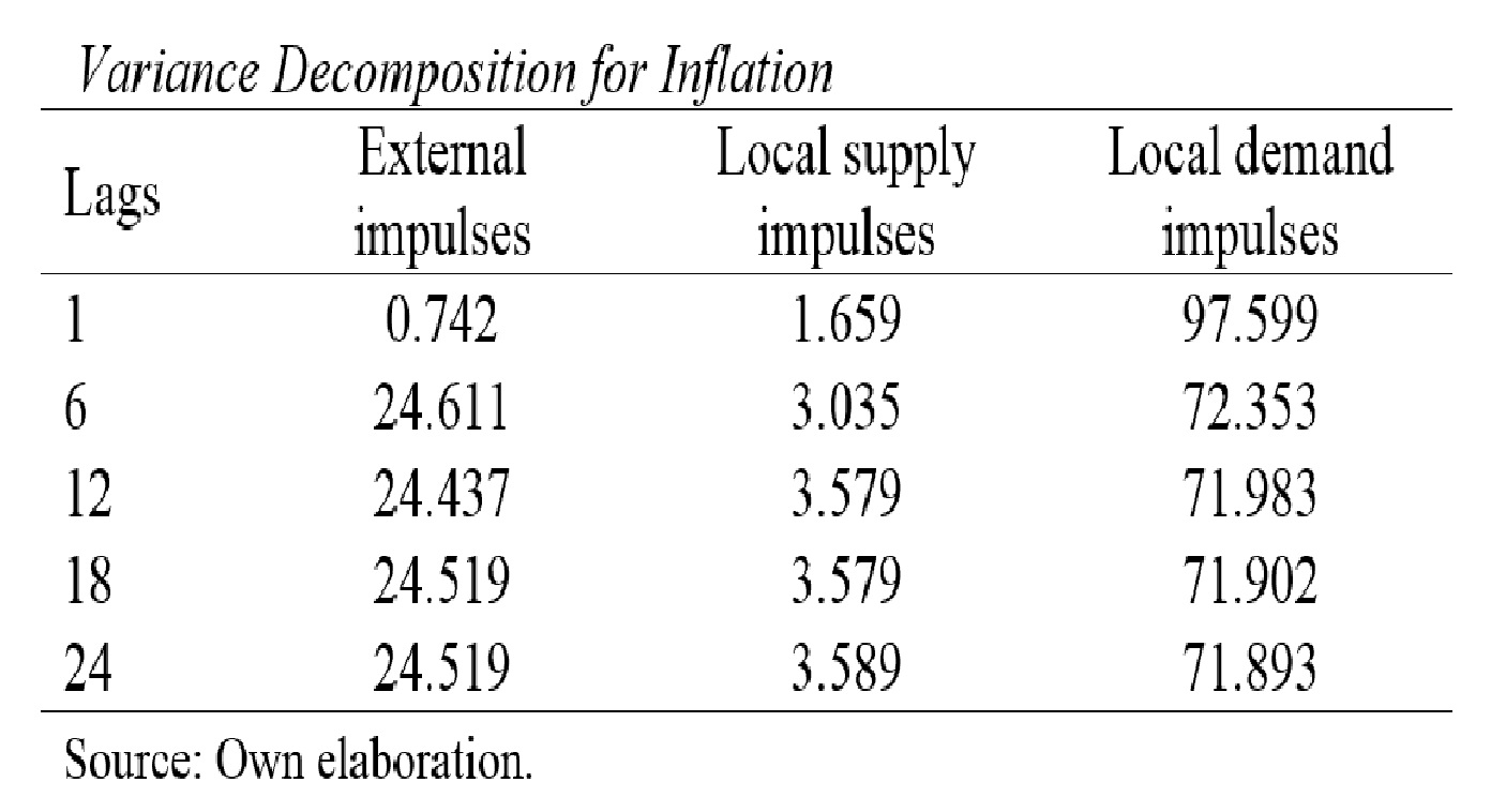 On the other hand, the dynamics of inflation seems to be determined by the disturbances in demand and the Taylor rule. Both are approximately 97%, with demand shocks exceeding 70% in most of the period and 97% in the first. After a period, supply impulses are only about 3%.