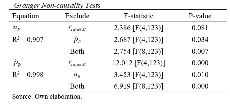 To explore the relationships between the variables more deeply, the Granger non-causality test presented in Table 6 points out that forecasts can be obtained in the evolution of the movements of the inflation rate and unemployment in Puerto Rico.