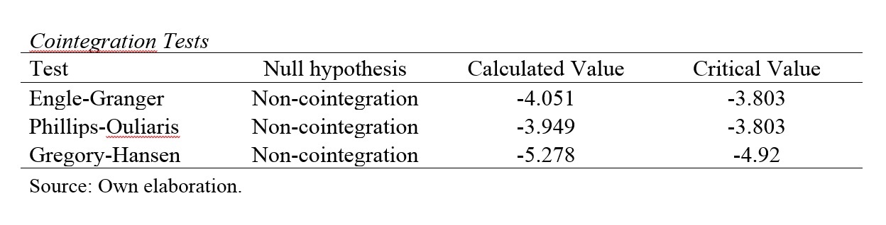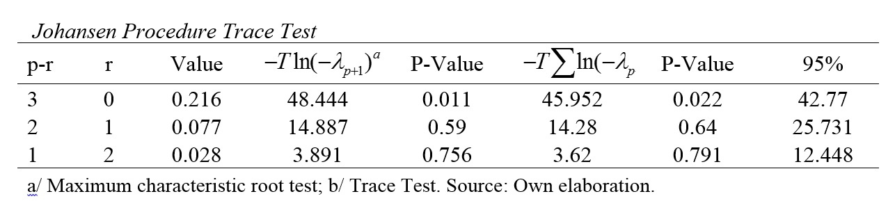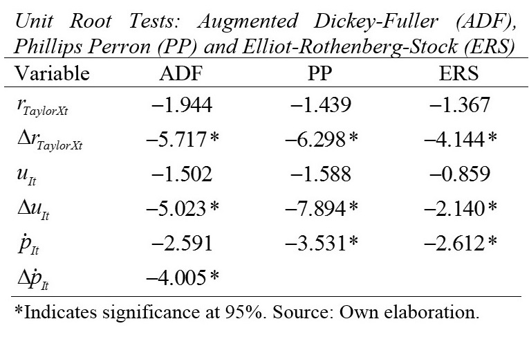 The unit root tests presented in Table 1 indicates that both the unemployment rate and the variables that represents the Taylor rule are of order I (1); nevertheless, even though the ADF test for inflation indicates that it is I (1), both the PP and the ERS (1996) tests suggests that the inflation series is I (0); therefore, it was concluded that the series is I (0). The similarity observed in the order of integration of the series can show the possibility of a stable relationship over time, which suggests that it exists in the long run (Fuller, 1976; Dickey & Fuller, 1981; Elder & Kennedy, 2001). These shocks can permanently alter the level of the variables and suggest the need to use cointegrated series to obtain unbiased and consistent estimators and solve the problem of spurious regressions (Elder & Kennedy, 2001). The Akaike, Schwartz, and Bayesian information criteria determined the number of lags.