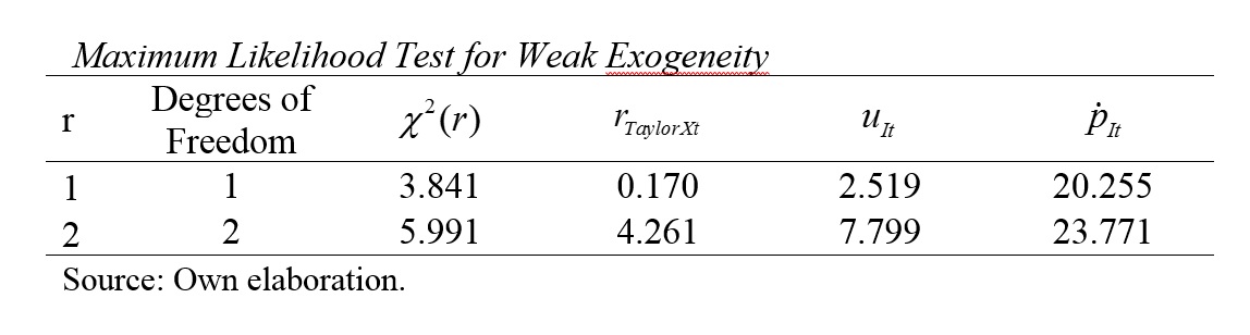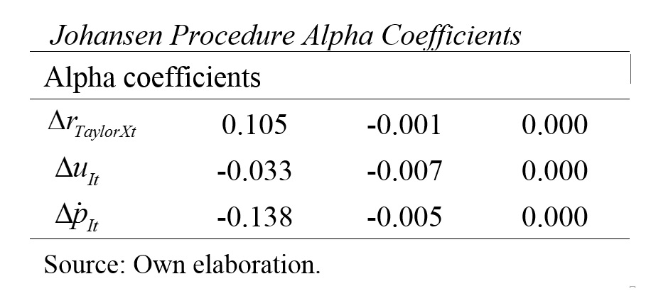 According to the weak exogeneity tests, for the Taylor rule, this hypothesis is accepted for this variable and the unemployment rate, but rejected for the inflation rate. This occurs in spite of the fact that the values of the alphas for the co-integration vectors, synthesized in Table 5, are very close to zero. This indicates that all the variables contain relevant information to explain the behavior of the system. Given the low value of the alpha coefficients, the exclusion of any of the variables considered may lead to obtaining invalid statistical inferences and the loss of relevant information to get an appropriate estimate of the information-generating process.