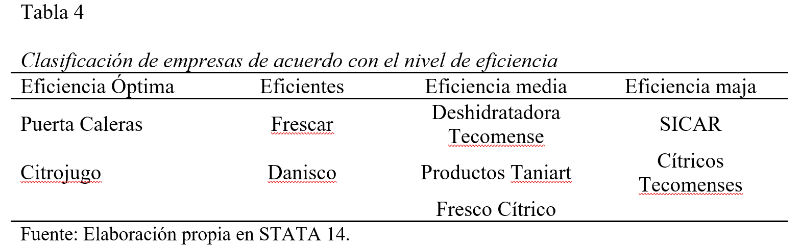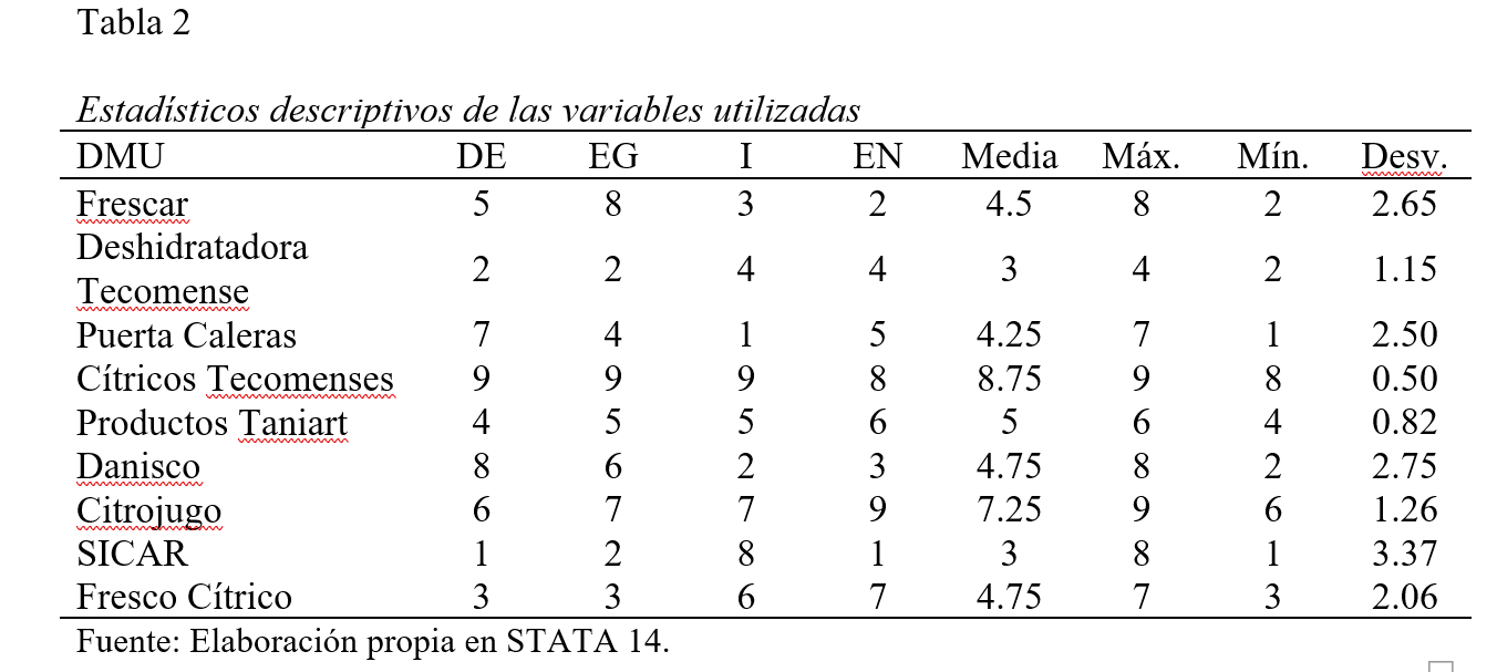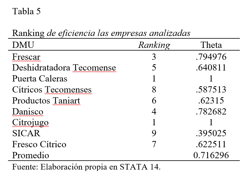 Los resultados de la eficiencia técnica de las DMU se ilustran en la Tabla 2, donde aparece reflejada la información de la varianza registrada por el índice de eficiencia para cada una de las empresas utilizadas para este análisis con relación al estimador de eficiencia. Esto supone la aproximación de medidas de competitividad de las empresas del sector del limón en Colima.