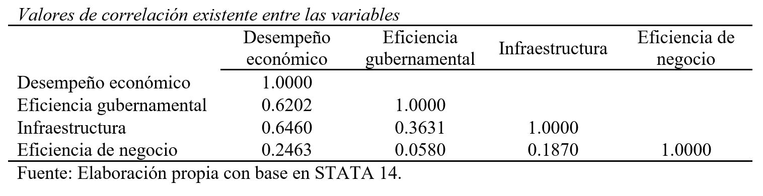 La primera variable se refiere a información del entorno económico en que se desenvuelven las empresas estudiadas; esta mide aspectos tales como: economía doméstica, comercio, inversión internacional, empleo y precios. La segunda evalúa aspectos relacionados con las finanzas gubernamentales, las políticas públicas, el aspecto institucional, la reglamentación empresarial y el contexto social. La tercera está relacionada con la infraestructura logística, las tecnologías de información y comunicación, las aportaciones científicas, la legislación medio ambiental y las competencias del personal. La eficiencia de negocio busca generar información sobre las normas internacionales, el mercado laboral, las finanzas, la gestión y las actitudes y los valores organizacionales.