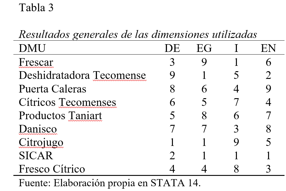 El ranking varía respecto a qué empresa ocupa la primera posición. Así, la tabla anterior muestra que la dimensión de desempeño económico la lidera la empresa Citrojugo y la dimensión de eficiencia gubernamental es liderada por tres empresas: Deshidratadora Tecomense, Citrijugo y SICAR. En la tercera dimensión se ubican, en primera posición, SICAR y Frescar; y en la última dimensión lidera nuevamente SICAR.