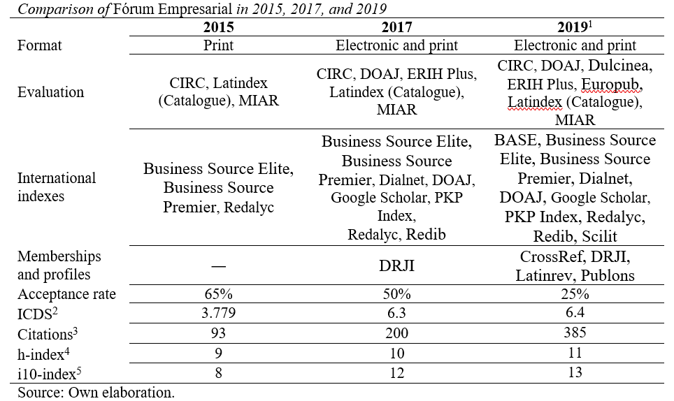 Over the past four years, we have developed a strategic editing and management plan to meet the criteria of quality peer-reviewed journals, as well as to increase the international projection, visibility, and utility of Fórum Empresarial. Table 1 summarizes the results of this effort, comparing the status of the publication in 2015, 2017, and 2019 in various elements of standardization. This work has improved the internal processes of the journal, strengthened its position in the region, and allowed it to be evaluated in specialized databases and prestigious indexes.