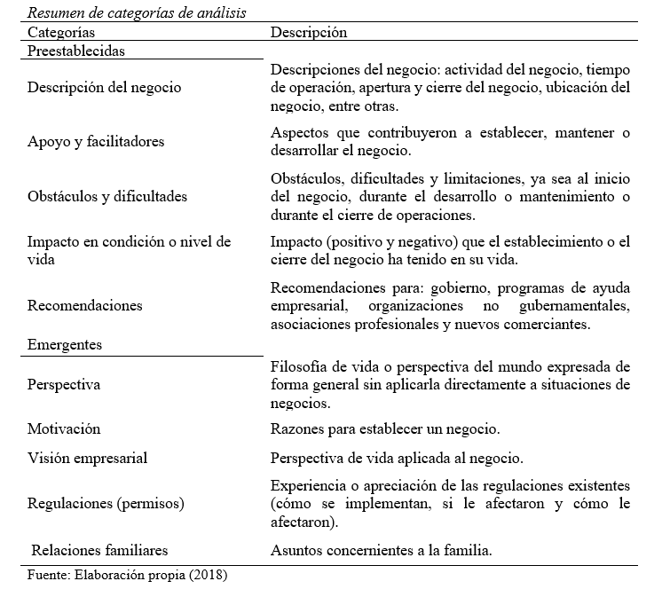 Las entrevistas y los grupos focales fueron grabados y transcritos. Se utilizó la técnica de análisis de contenido (Neuendorf, 2017), para describir de manera objetiva y sistemática las respuestas de los participantes. Las respuestas se analizaron a la luz de categorías preestablecidas y categorías emergentes (Tabla 1). Para este artículo, se estará presentando el análisis de las siguientes categorías: descripción del negocio, motivación, apoyo y facilitadores, obstáculos y dificultades, regulaciones, y recomendaciones.