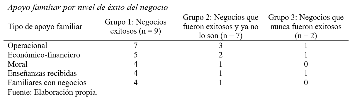 Apoyo por nivel de éxito del negocio. En la Tabla 2, se resume la cantidad de veces que se mencionó el apoyo familiar recibido, por nivel de éxito del negocio y tipo de apoyo. El grupo de empresarios que sigue siendo exitoso recibió la mayoría del apoyo familiar mencionado. Los tres empresarios que mencionaron a sus hijos como motivación para salir adelante pertenecen al grupo 1.