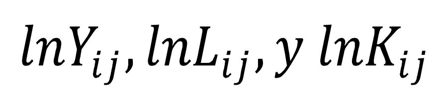 son el logaritmo natural de la producción, trabajo y capital, respectivamente. Las tres se toman de los Censos Económicos y se utilizan las siguientes variables: para la Producción (Y), la Producción Bruta Total (clave A111A de los censos); para el Trabajo (L), el Personal Ocupado Total (clave H001A de los censos); y para el Capital (K), el Acervo Total de Activos Fijos (clave Q000A de los censos). Nótese que estas variables son estáticas, es decir, son captadas en un punto en el tiempo durante la toma del censo.