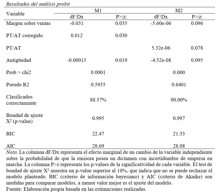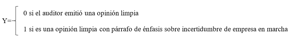 En la siguiente etapa de análisis multivariado, se empleó un modelo de variable dependiente binaria probit a fines de determinar los factores que inciden en la probabilidad de que una empresa tenga un dictamen con párrafo de énfasis sobre la incertidumbre de empresa en marcha. Smith (2019) nombra al modelo probit entre las herramientas empleadas para la investigación en contabilidad. Ha sido empleado en trabajos relacionados con la incertidumbre sobre empresa en marcha y riesgo de quiebra, como en Koh (1991), Lennox (1999), Zeitun y Gang Tian (2007), Klieštik et al. (2015) y Berglund et al. (2018). Dado el reducido tamaño de la muestra se analizaron distintas especificaciones del modelo, estudiando en particular la incidencia de las variables significativas en el estudio bivariado. El modelo de respuesta binaria probit se estima según la ecuación 1:
