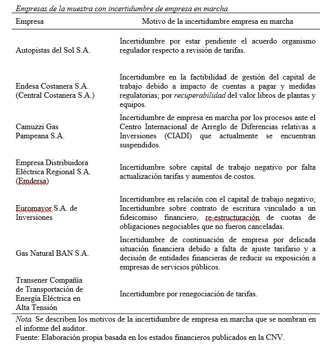 2. Opinión limpia con párrafo de énfasis sobre (la) incertidumbre de empresa en marcha: son siete empresas que se detallan en la Tabla 1. Como puede observarse, en seis casos se trata de firmas vinculadas con la provisión de servicios públicos, lo cual se relaciona con la falta de actualización de tarifas vigentes del 2002 al 2015.[2]