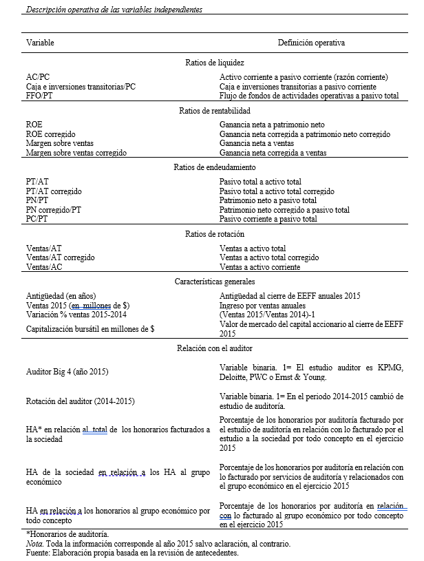 Las variables explicativas se clasifican en (a) ratios financieros; (b) características generales de la empresa; y (c) variables de la relación con el auditor. Los datos provienen de los estados financieros (EEFF) anuales consolidados finalizados durante al año 2015. Debido a la potencial distorsión en el análisis financiero que introduce la ausencia de ajuste por inflación en un contexto de elevada situación inflacionaria como ocurre en Argentina, las cifras del estado de situación patrimonial y del estado de resultados han sido corregidos en forma aproximada empleando el índice de precios del consumidor publicado por el Centro Regional de Estudios Económicos Bahía Blanca (Creebba, 2017).[3] En la Tabla 2, se describe la definición operativa de cada variable.