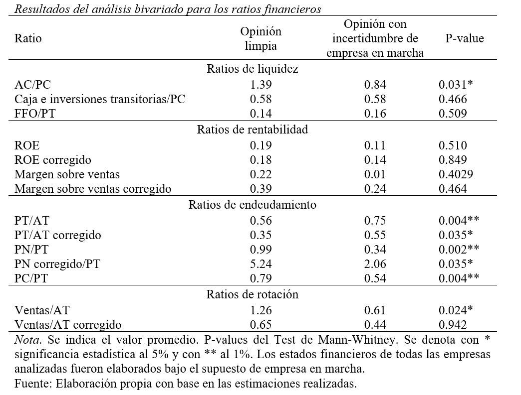 Los resultados de este trabajo permiten asociar los ratios del análisis financiero tradicional con la inclusión de un párrafo de énfasis en el informe del auditor por existencia de la incertidumbre de empresa en marcha. En particular, en el análisis bivariado se observa que empresas donde el informe del auditor no presenta párrafo de énfasis al respecto, poseen mayor razón corriente y mayor rotación de sus activos totales, y menor nivel de endeudamiento (tanto con ratios originales como corregidos en forma aproximada por inflación). El tamaño de la empresa no resulta relevante, pero sí es significativa la antigüedad.