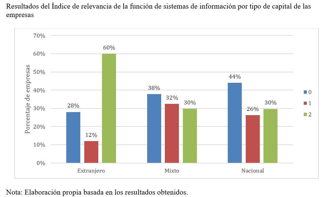 Una importante mayoría de empresas de capital nacional carece de función de sistemas, mientras que las de capital mixto presentan una distribución más homogénea y pareja. En el otro extremo, las de capital extranjero cuentan con funciones de sistemas comprometidas con la toma de decisiones en una gran mayoría. La Figura 9 permite visualizar la distribución.