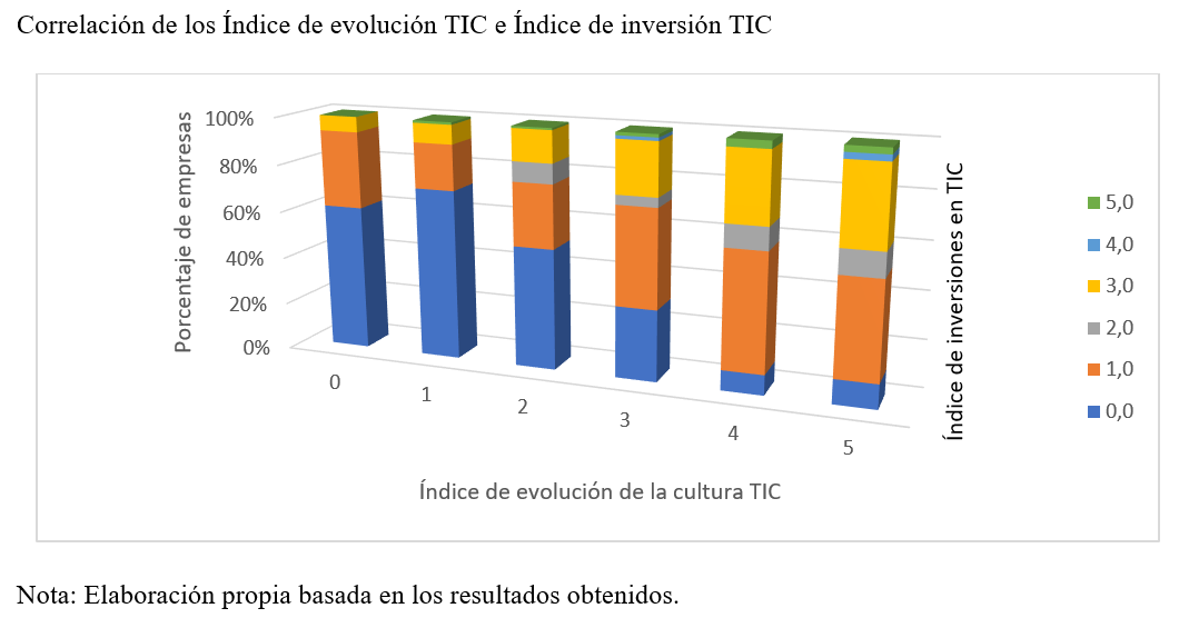 Al cruzar los índices de inversiones en TIC y el de evolución de TIC, se puede apreciar una correlación positiva que, si bien se presenta débil, es estadísticamente válida, de manera que las empresas con menor nivel de evolución carecen en su mayoría de inversiones en TIC. Mientras que, en el otro extremo, se visualizan a las empresas de mayor evolución con sólidos índices de inversión en TIC. Puede verse aquí también que, aun en las firmas de mayor evolución de su cultura TIC, cuando invierten lo hacen mayoritariamente sin acompañarlo de inversiones adicionales.