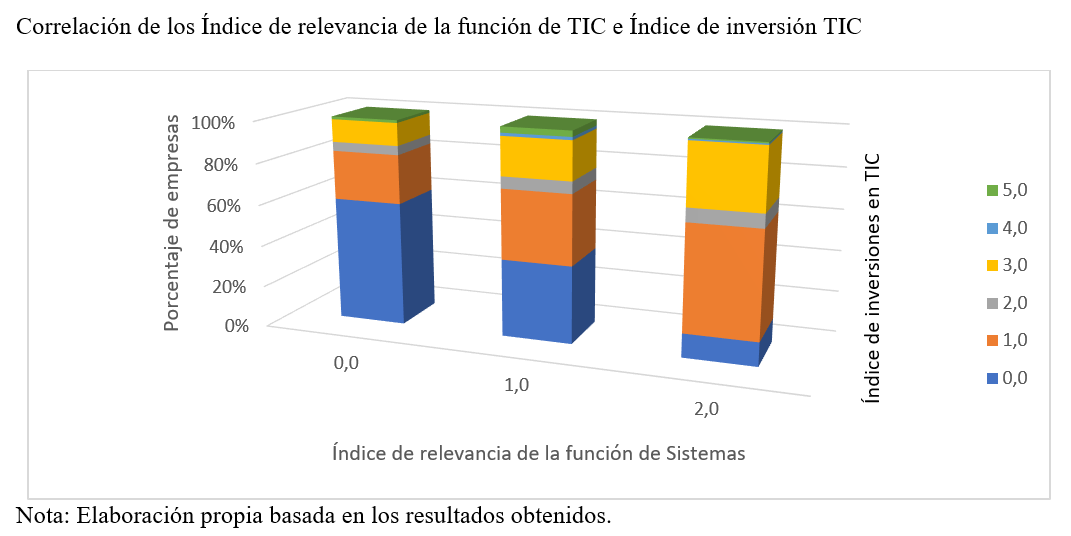 La figura de pila permite ver en el eje horizontal los 5 niveles del Índice de evolución de la cultura TIC; en el eje vertical, la distribución porcentual del Índice de inversión TIC para cada nivel de evolución (IETIC). En color celeste se indica el IITIC 0, en anaranjado el IITIC 1, en gris el IITIC 2, en amarillo el IITIC 3, en azul el IITIC 4 y en verde el IITIC 5. Si se observa el nivel más bajo de evolución (primera pila de la izquierda), se distingue una clara participación de empresas que no han realizado inversiones (color celeste), una menor participación de empresas que solo han invertido en TIC (color anaranjado) y una muy baja participación de empresas que han hecho inversiones adicionales moderadas. Si luego se observa el nivel 3 de evolución (cuarta columna desde la izquierda), se puede identificar un claro predominio de empresas que solo han invertido en TIC, seguida de las empresas que no ha realizado inversiones y, luego, las que han realizado inversiones adicionales. Finalmente, en el mayor nivel de evolución (sexta columna desde la izquierda), se visualiza una clara participación de empresas que solo han invertido en TIC, seguidas de las empresas que han realizado inversiones adicionales moderadas y, por último, una muy baja participación de las empresas que no han invertido. Obsérvese que, si bien la participación de empresas que han realizado inversiones adicionales moderadas aumenta con la evolución de la cultura TIC, son mayoría aquellas que solo invierten en TIC. Al evaluar por Pearson la relación entre el Índice de relevancia de la función de sistemas y el Índice de inversión TIC se observa una correlación débil, pero estadísticamente válida.