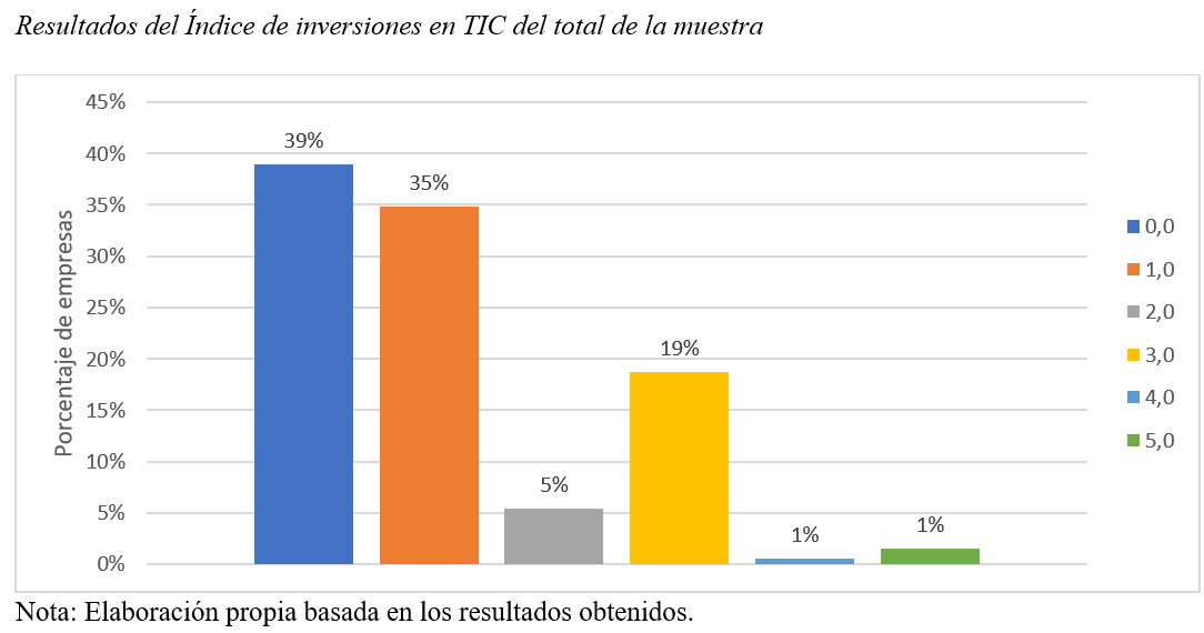 Se pueden visualizar en el eje vertical los valores de los porcentajes de empresas de la muestra, y en el eje horizontal, los agrupamientos de las empresas distribuidos en base a los valores obtenidos del Índice de inversión en TIC identificados por colores, asumiendo el color azul para el valor del índice 0, anaranjado el 1, gris el 2, amarillo el 3, celeste el 4 y verde el 5. Se puede observar que una gran mayoría de las empresas no ha realizado inversiones (el 39%) o las ha realizado sin incluir inversiones adicionales (35%); por otro lado, el 19% ha realizado inversiones en TIC con inversiones adicionales importantes obteniendo el valor 3 en el índice. El resto de los resultados del IITIC, cuyos valores son 2, 4 y 5, no representa un porcentaje importante de empresas, siendo estos del 5%, 1% y 1%, respectivamente.