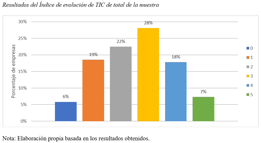 El índice se desarrolla en un rango de 0 a 5, con un promedio de 2.5, una mediana de 3 y un desvío estándar de 1.3. Las empresas que han obtenido un índice con valor 0 son aquellas que no han generado nuevos productos y servicios debido al impacto de las TIC, no han generado nuevos modelos de organización, su personal no desarrolla trabajo cooperativo a través de las TIC y no realizan compras ni ventas por medios automáticos, encontrándose en el nivel más bajo de evolución. En el otro extremo, las empresas que han alcanzado el valor máximo del índice con un 5 son aquellas que hacen uso pleno de los beneficios del uso de las TIC, desarrollando trabajo colaborativo y de innovación a partir de sus sistemas de información.