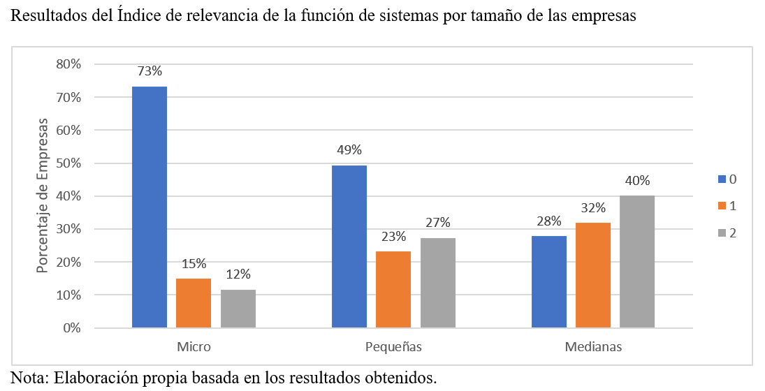 Se visualiza en este gráfico que los tres grupos de empresas presentan patrones distintos de distribución, en donde las microempresas se destacan por la carencia de la función de sistemas (con el 73% de las empresas), las pequeñas muestran una distribución más pareja entre los índices, con una preponderancia de la falta de función de sistemas (con el 49% de las empresas) y las medianas una distribución más homogénea con una alza continua y pareja entre los valores del 0 a 3 del 28%, 32% y 40% de empresas medianas, respectivamente. Al evaluar por Pearson la relación entre el tamaño de las empresas y el IRFSIS, se observa una correlación débil, pero estadísticamente válida.