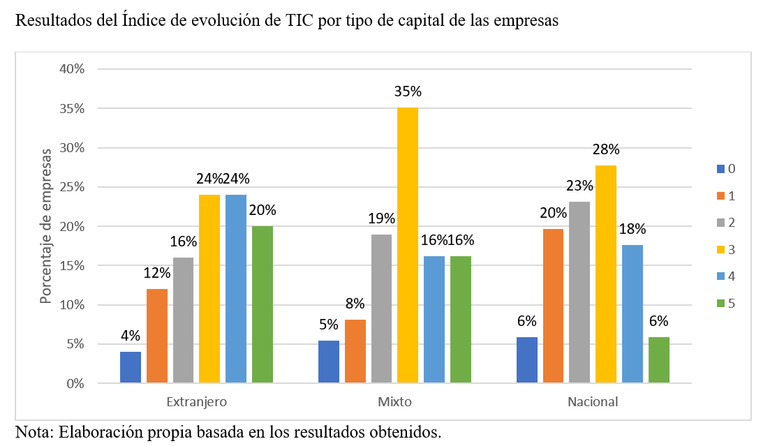 El 6% de las empresas de capital nacional se encuentra en el estadio más bajo de evolución, con un 28% en un estadio de 3 y, nuevamente, 6% en el estadio más alto. Si se evalúan las empresas de capital mixto, el 5% se encuentra en el escalón más bajo, el 35% en el medio y 16% en el más alto. Finalmente, el 4% de las empresas con composición de capital extranjero se encuentra en el más bajo, el 24% en el intermedio (estadios 3 y 4) y el 20% en el máximo. Al evaluar por Pearson la relación entre la propiedad del Capital de las empresas y el IETIC, se observa una correlación débil, pero estadísticamente válida.