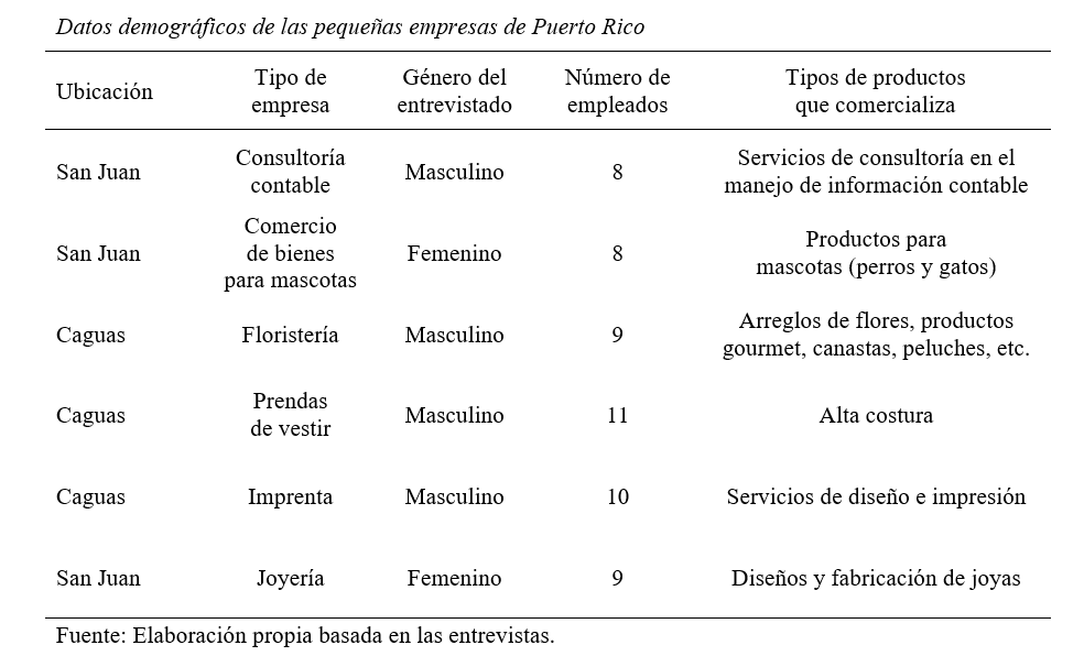 En la Tabla 1 se puede observar que las pequeñas empresas se encuentran situadas en el área metropolitana de San Juan y Caguas, y dos ofrecen servicios mientras que la mayoría vende productos tangibles de diferentes tipos. En términos del género de los participantes, la mayoría era masculino. Por último, la cantidad de empleados fluctúa entre ocho y once.