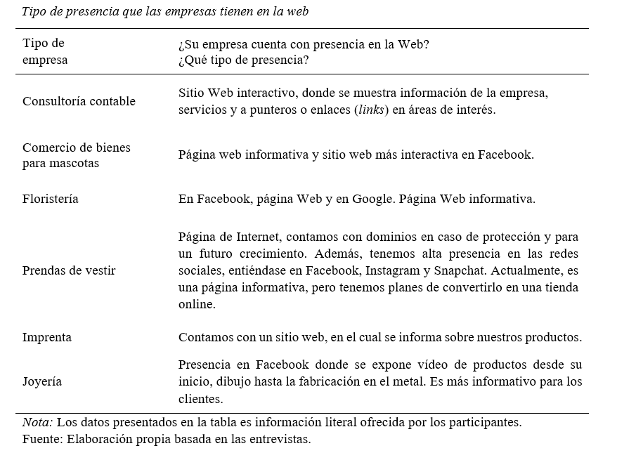 De la Tabla 2 se puede inferir que no existen diferencias significativas en los diferentes tipos de empresas respecto al tipo de presencia que cuentan en la Web. La gran mayoría cuenta con una página o sitio Web principalmente informativo; además, tiene presencia en redes sociales (principalmente Facebook), donde busca ser más interactivo.