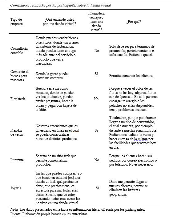 Los datos reflejan que los gerentes entrevistados poseen pequeñas empresas con pocos empleados, por lo que cuentan con recurso humano limitado. El tener disponible una cantidad restringida de recursos (Tornatzky et al., 1990) puede ser un factor que influye en que algunas de estas empresas no se interesen en montar tiendas virtuales. Aun cuando todas tienen alguna experiencia con la Internet, las mismas están limitadas mayormente a ser utilizada como promoción a través de su página Web o redes sociales; solo la mitad considera que sí puede ser beneficioso montar una tienda virtual, ya que puede aumentar sus clientes extendiendo sus límites geográficos. Sin embargo, la otra mitad no lo considera beneficioso porque su producto no es apto para este tipo de venta o porque los clientes no están acostumbrados a comprar a través de este canal. Este dato, unido al limitado conocimiento de lo que es la tienda virtual, concuerda con lo planteado por Molla y Licker (2005. sobre la dimensión e-readiness organizacional. Los investigadores señalan que los factores internos de la organización reflejan el grado en que los directivos están o no están dispuestos a tomar la decisión de montar una tienda virtual.