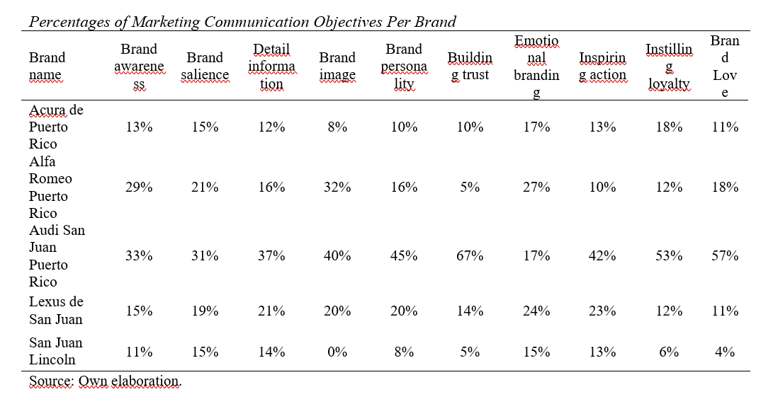 When reviewing the four most used objectives in Table 4 (brand awareness, brand salience, detail information, and emotional branding), Audi San Juan Puerto Rico represented the highest percentage for brand awareness (33%), brand salience (31%), and detail information (37%). Alfa Romeo Puerto Rico followed the percentage ranking for brand awareness, brand salience (29% and 21% respectively), but represented the highest percentage for emotional branding (27%). Alfa Romeo de Puerto Rico and San Juan Lincoln stayed at the lowest percentages on the four objectives in comparison with the other brands. Lexus de San Juan had the second highest percentage for emotional branding (24%) and detail information (21%).