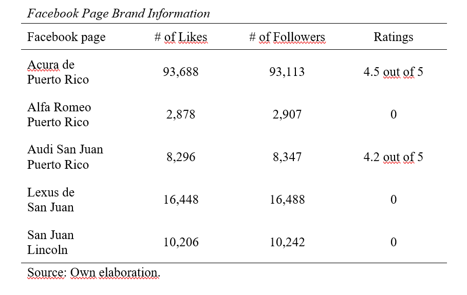 The selected brands for this study were luxury car brands with an active corporate Facebook page in Puerto Rico. The criteria for choosing the brands was determined by brands that are included in the Puerto Rico Top 20 Retailers from the Caribbean Business Magazine Book of List 2017 with active business pages on Facebook. Five luxury car brands were selected: Acura de Puerto Rico, Alfa Romeo Puerto Rico, Audi San Juan Puerto Rico, Lexus de San Juan, and San Juan Lincoln. The brands selected have an official Facebook page and an active DCM (posts frequently). Used as reference for the sample was a list of the top local car retailers from the magazine Caribbean Business Book of Lists 2017. The samples chosen for examination were brands mentioned in this magazine that were functional and had Facebook page. Brands that are not currently operating or that are without Facebook pages were excluded from the study. The compilation of data begun from February 15, 2018 up to March 31, 2018. The analysis time frame for the examination was 45 days, recollecting a total of 109 posts. The data was transferred into an excel sheet where it was decodified using the communication objectives in the content analysis rubric.