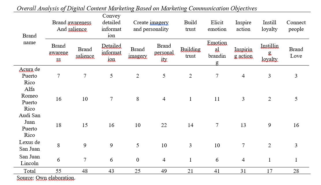 Resumen: El propósito de este estudio fue determinar qué tipo de objetivos de comunicación de marketing están presentes en el marketing de contenidos digitales desarrollados por marcas de lujo automotriz con presencia en Facebook en Puerto Rico. Se utilizó un diseño de estudio longitudinal de casos para analizar cinco marcas de autos de lujo utilizando un análisis de contenido en las publicaciones de Facebook. Se identificaron objetivos de comunicación de marketing utilizados a través de estrategias de marketing de contenido, tipo de contenido multimedia y métricas de redes sociales. Nuestros resultados mostraron que los objetivos más utilizados son el conocimiento de la marca, la personalidad de la marca y la saliencia de la marca. Otro resultado significativo es que el marketing de contenidos digitales utilizado por las marcas se centra en ser más visible y reconocido; también, reflejando rasgos y actitudes similares a los humanos.