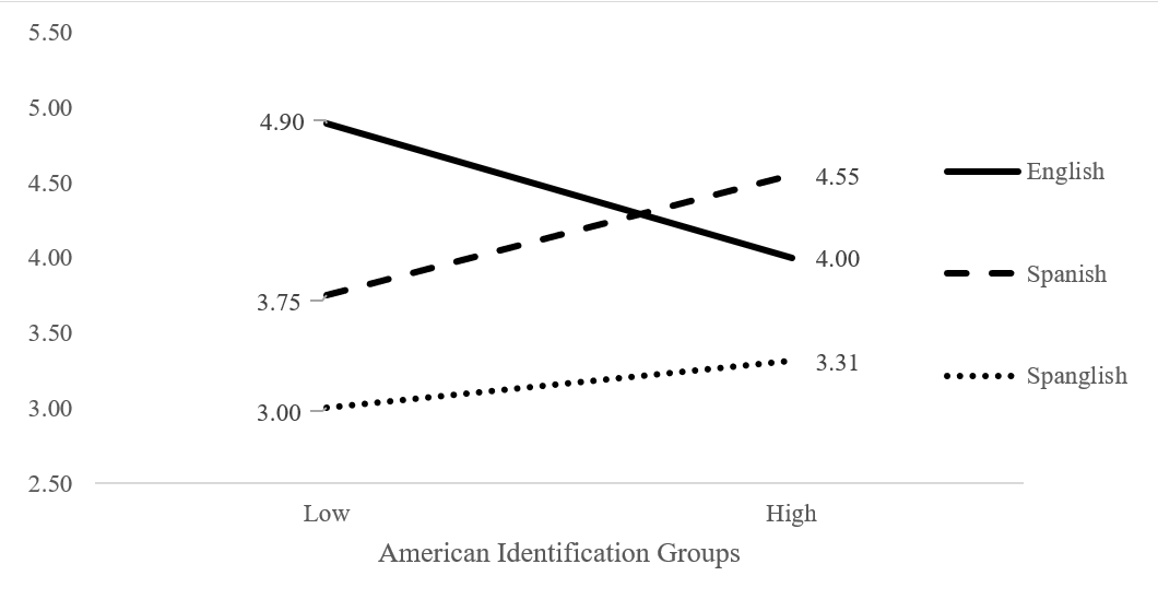 Under the former conceptualization, it would be expected that bilingual Hispanic consumers that highly identify with the American culture will not feel the need to gain social desirability, as they highly identify with the majority culture. Consequently, the stereotype that American identifiers have of Hispanic consumers that speak English or Spanish would show no significant differences. On the other hand, bilingual Hispanic consumers that have low identification with the American culture are more likely to feel the need to gain social approval. As a result, the stereotype that they hold about the majority group is likely to be more favorable than the stereotype they have of their own culture. However, for high and low American identifiers, code-switching is considered a stigma, and language correctness is highly valued. Therefore, it would be expected that both groups would equally react unfavorably towards a source that uses code-switching.