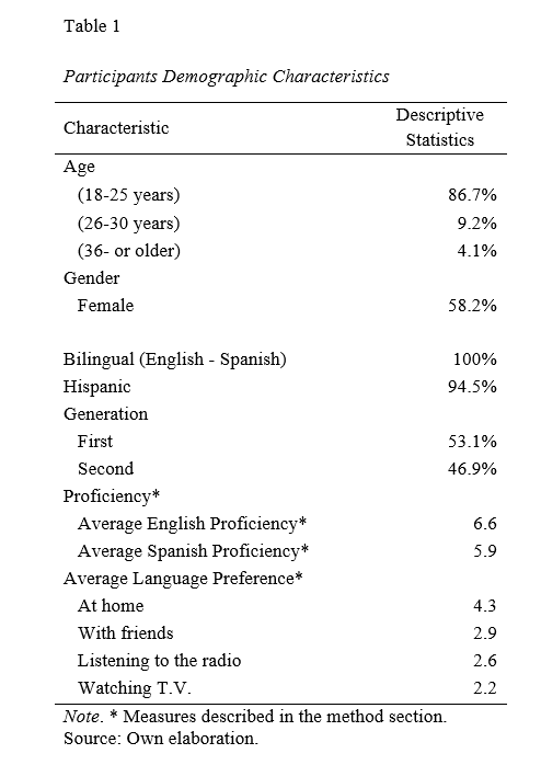 The study employed a 3 (levels of language: English, Spanish and code-switching) ´ 2 (levels of strength of American identification: high and low) between subjects, quasi-experimental design. To address the shortcomings of the quasi-experimental design, participants across the American identification groups were compared to demonstrate equivalency. Ninety-eight Hispanic bilingual students from a major state university in south Florida participated in exchange for extra credit. Participants were randomly assigned to one of the three language conditions (English, Spanish and code-switching) with the only difference being the source language. Participants’ demographic characteristics are reported in Table 1.