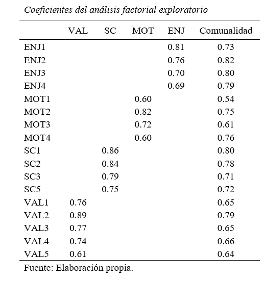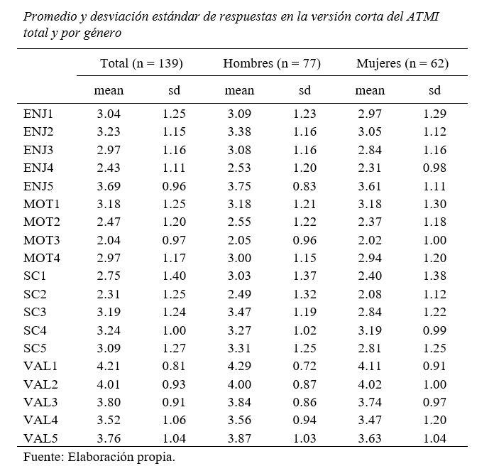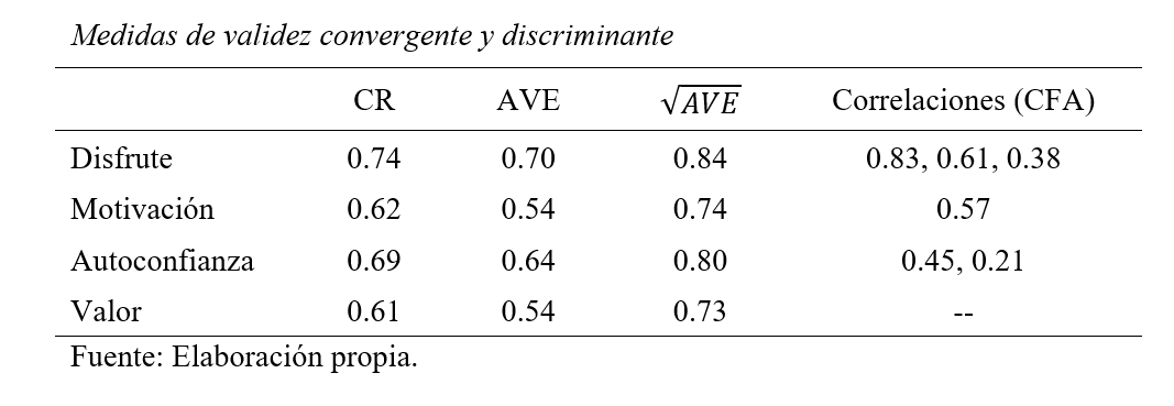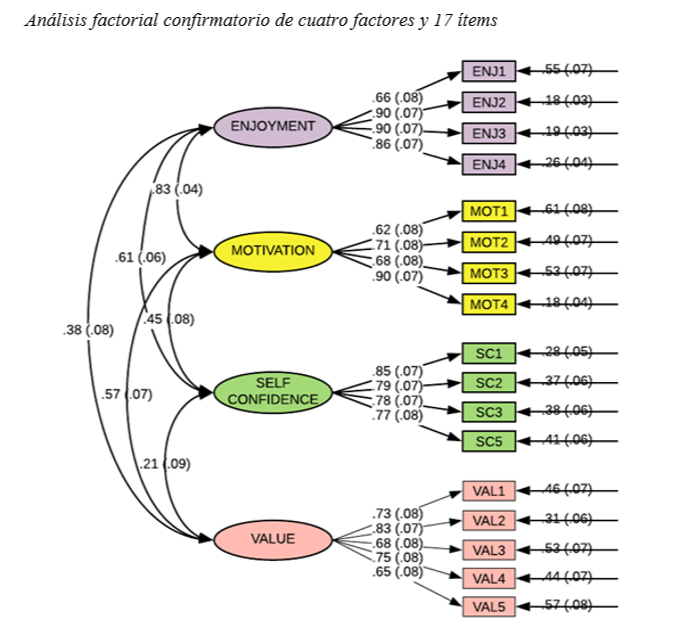 Después del análisis y selección de ítems se removieron 2 ítems del instrumento traducido y se retuvieron 17 ítems, distribuidos de la siguiente forma: 4 ítems de disfrute (enjoyment), 4 ítems de motivación (motivation), 4 ítems de autoconfianza (self-confidence) y 5 ítems de valor (value). Para verificar la consistencia interna se estimó el coeficiente alfa de Cronbach, este fue igual a 0.906. El coeficiente de alfa de Cronbach para los constructos de disfrute, motivación, autoconfianza y valor fue 0.897, 0.823, 0.875 y 0.846, respectivamente.