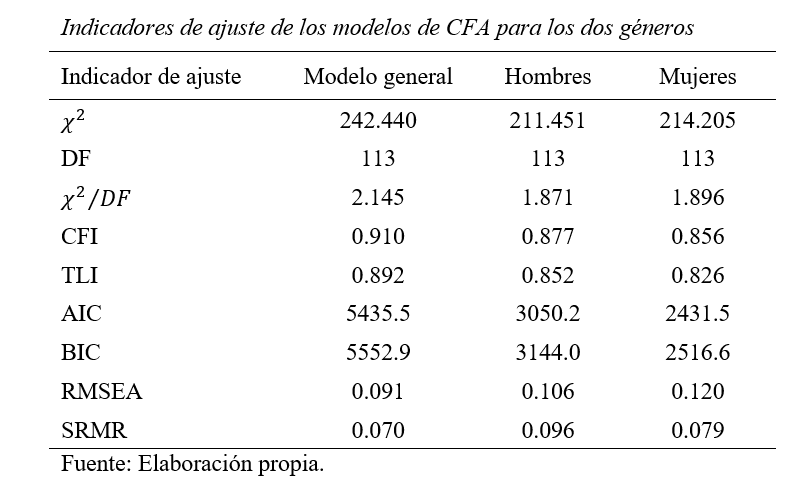 El procedimiento para la medición de la invarianza a través de género conllevó varias etapas. Primero, se construyó el modelo CFA para cada género para verificar que los modelos ajustados sigan el mismo camino que el modelo general ajustado. La Tabla 6 muestra los modelos estimados para hombres y mujeres; de los resultados se puede afirmar que los modelos estimados están bastante bien ajustados.