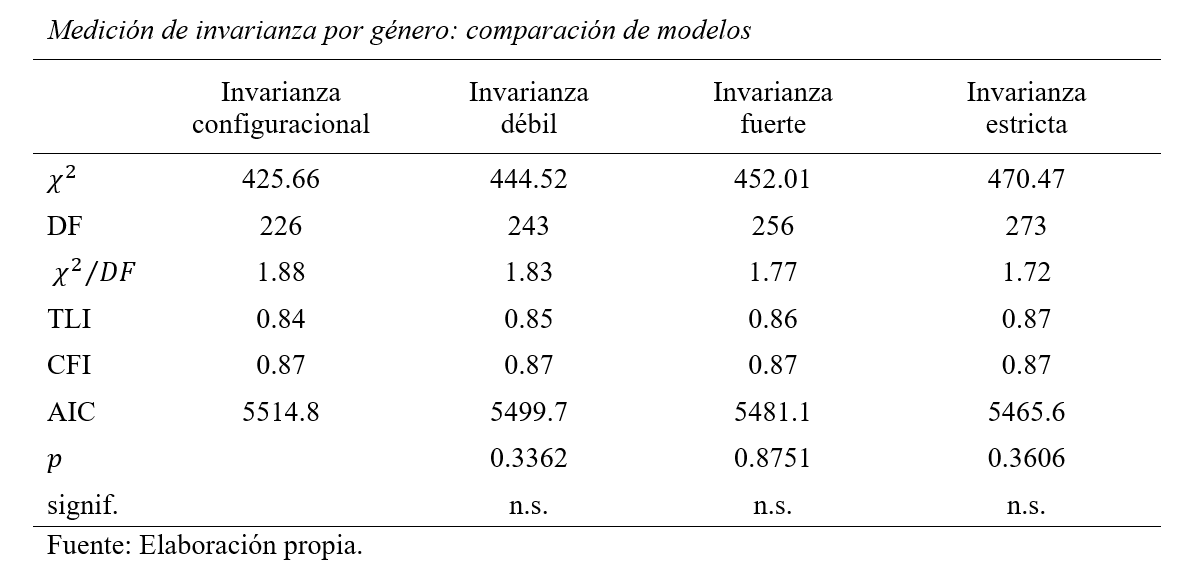 5. El modelo factorial confirmatorio demostró tener invarianza de medición por género, es decir que la estructura factorial del modelo ajustado va en el mismo camino que a través del género.