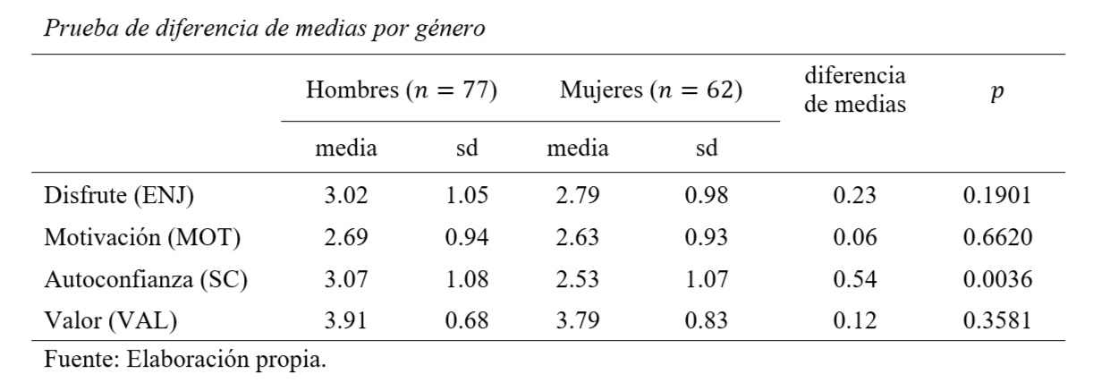 3. La consistencia interna del instrumento fue muy buena: el coeficiente alfa de Cronbach para los 17 ítems fue 0.906 y para los constructos disfrute, motivación, autoconfianza y valor fue 0.897, 0.823, 0.875 y 0.846, respectivamente.