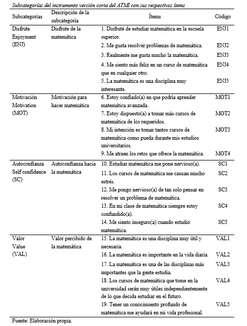 En la investigación se utilizó la versión corta del instrumento ATMI que desarrollaron Lim y Chapman (2013). Esta versión corta del ATMI tiene cuatro subcategorías que incluyen: disfrute de la matemática (cinco ítems); motivación para hacer matemática (cuatro ítems); autoconfianza hacia la matemática (cinco ítems); y valor percibido de la matemática (cinco ítems). Estas subcategorías junto con sus códigos se describen en la Tabla 1. La versión corta del ATMI incluye en total 19 preguntas. Las respuestas se evaluaron usando una escala de Likert de cinco puntos. Las respuestas en el instrumento oscilaban desde: muy en desacuerdo (1); en desacuerdo (2); neutral (3); de acuerdo (4); y muy de acuerdo (5).