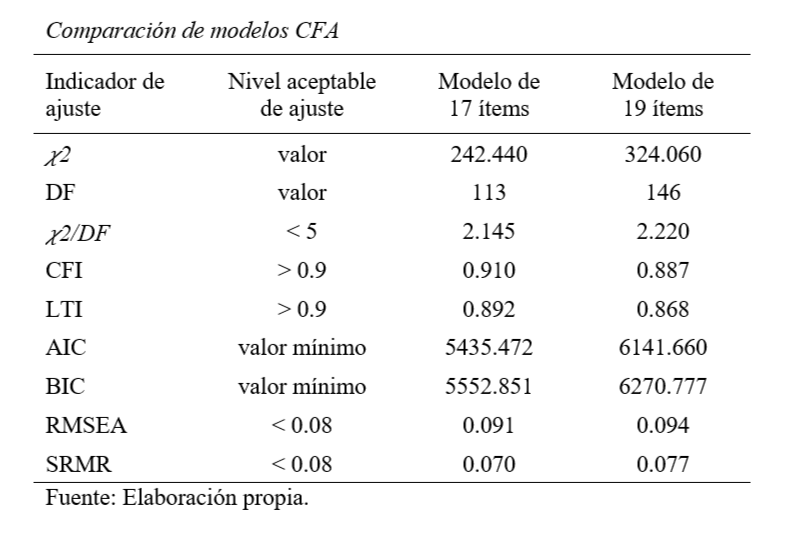 En la Tabla 4 se observa que los mejores indicadores son para el modelo de 17 ítems. Además, la prueba de diferencia de chi square: