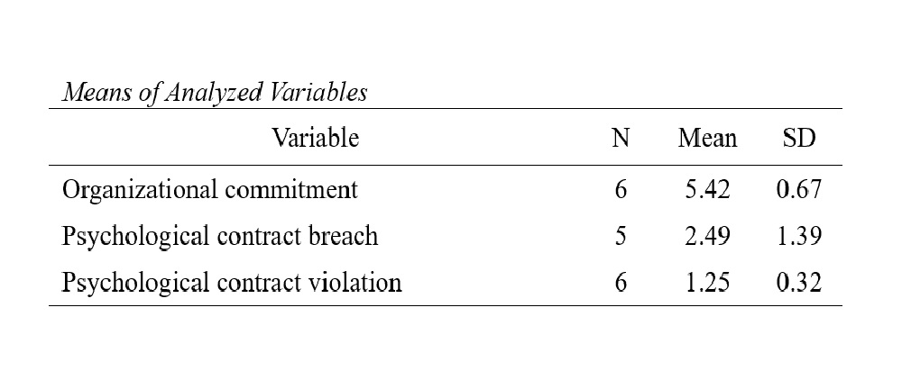 Table 1 depicts the means of the variables that facilitate understanding organizational commitment and psychological contract theory applied to this case study.