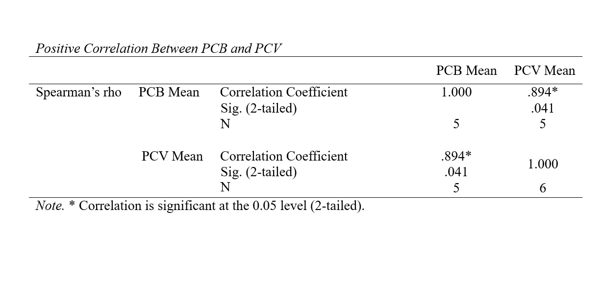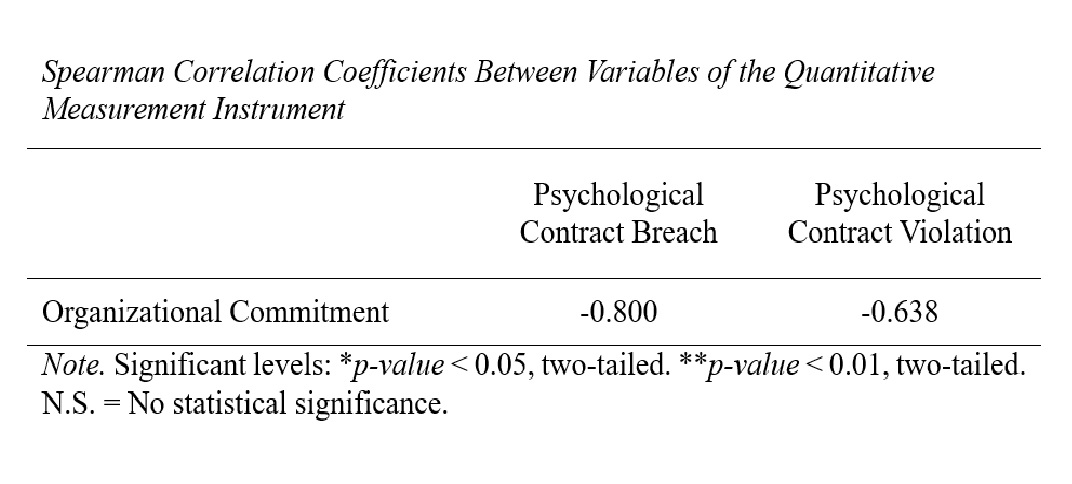 As shown in Table 2, there are low levels of perceived psychological contract breach (PCB) and perceived psychological contract violation (PCV); PCB is slightly higher than PCV. Using Spearman for statistical dependences between two variables, there are negative correlation coefficients between perceived PCB (-0.800) or PCV (-0.638) and OC. No statistical generalization was drawn from such a small sample, but the results are similar to other research that demonstrate this inverse correlation (i.e., Conway et al., 2011; Quiñones-González, 2016; Quratulain et al., 2018; Robinson & Morrison, 1995; Rodwell et al., 2015).
