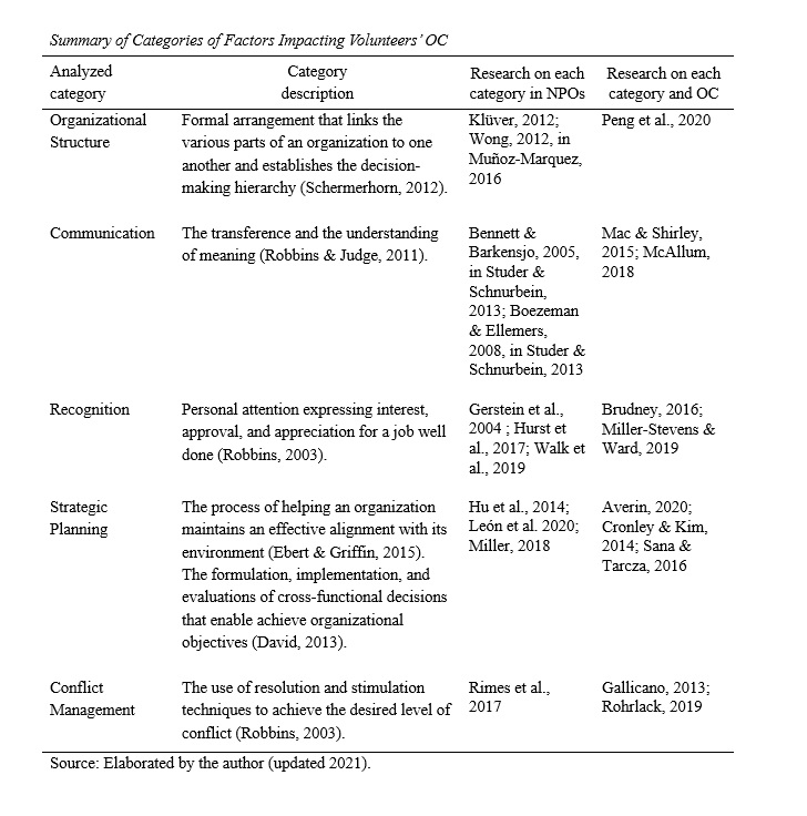 Empirical research focuses on each of the five categories of organizational factors which are identified in this study, as well as in the context of NPOs associated to OC. They are summarized in Table 4 with a brief concept description, and research found on each category in the non-profit context, also related to OC.